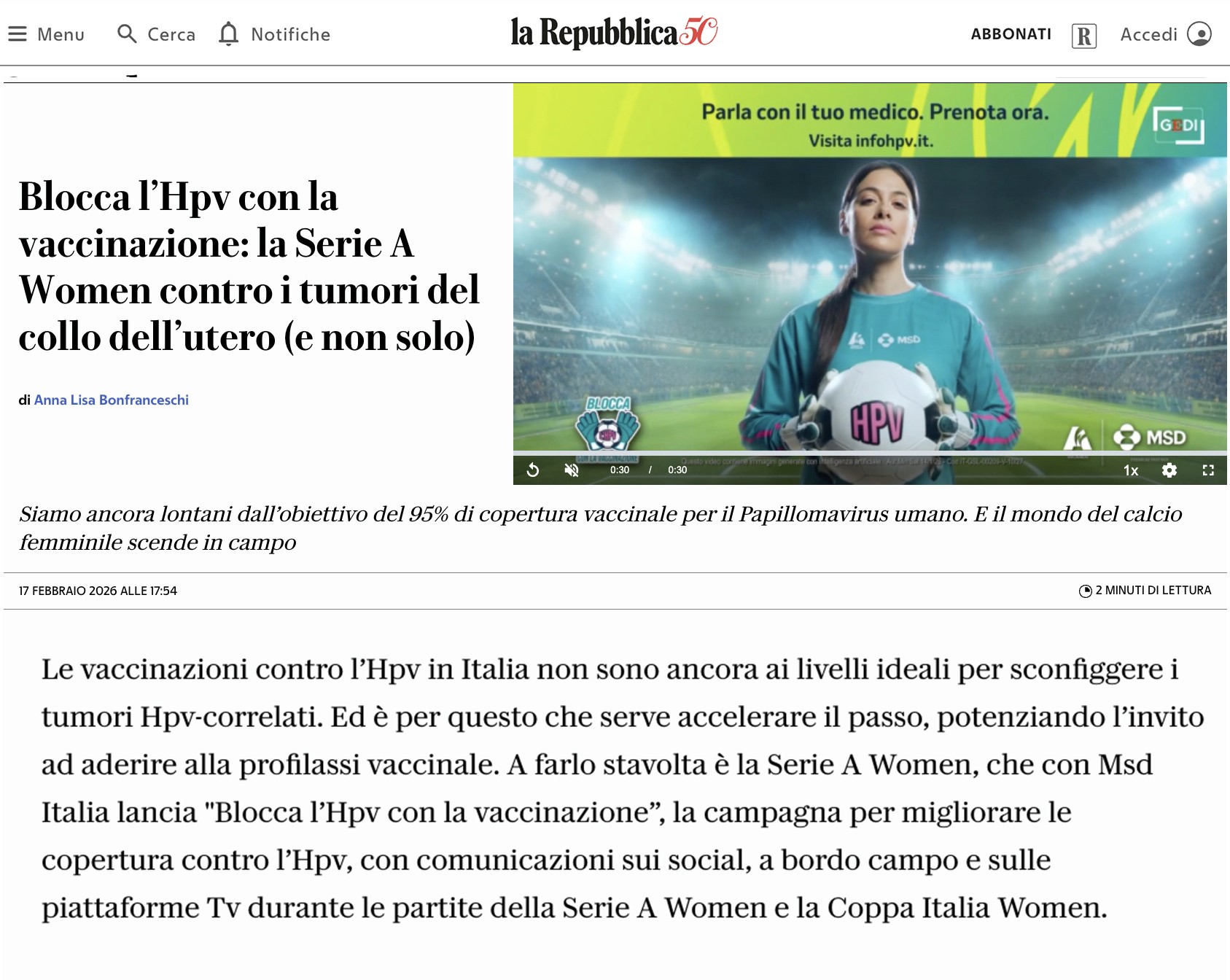 Per MSD, in collaborazione con Federazione Italiana Giuoco Calcio e con la Serie A Femminile, è stata sviluppata una campagna di sensibilizzazione dedicata al vaccino contro l’Human Papillomavirus.