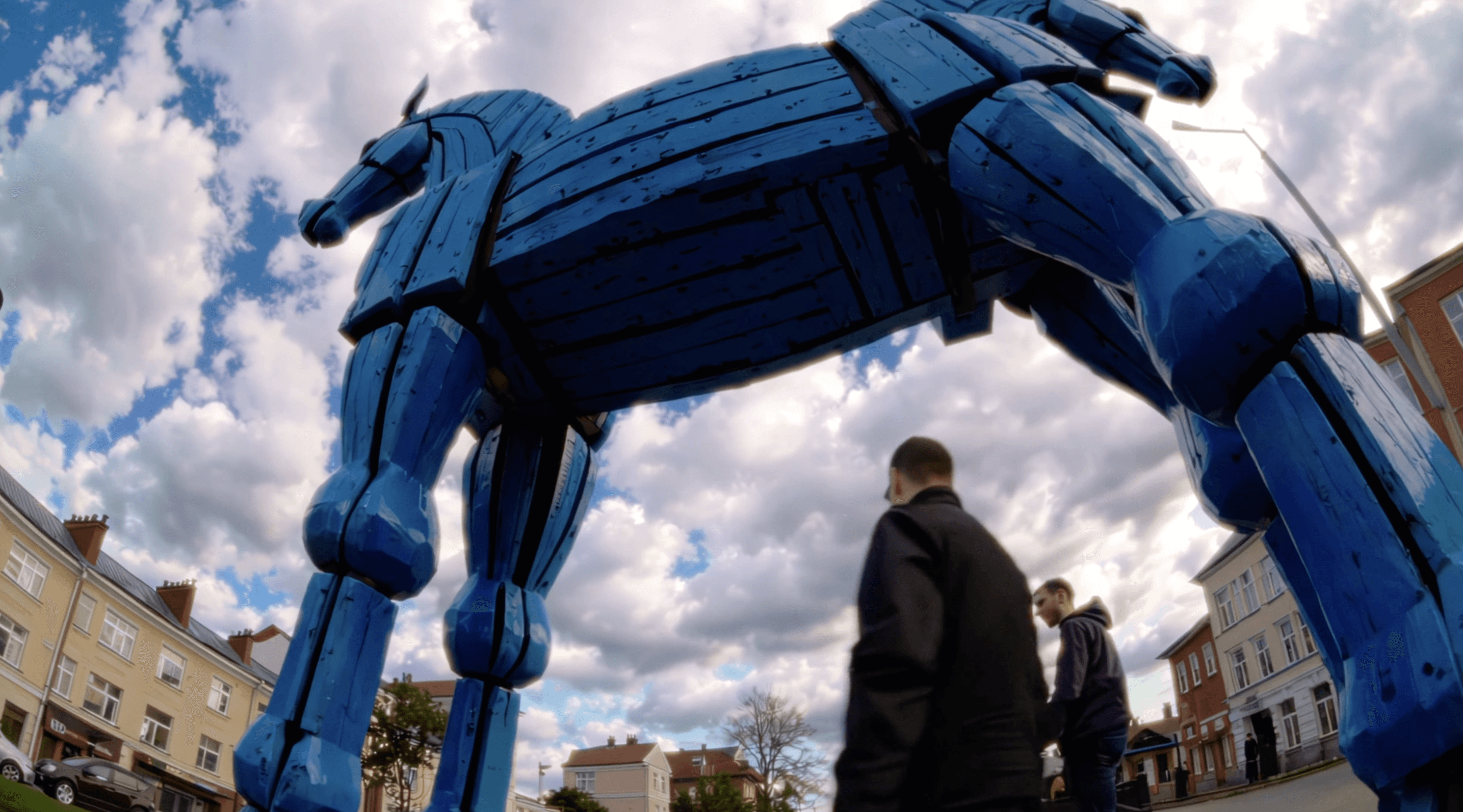 Accanto a questa figura appare anche una variazione azzurra del cavallo, un riferimento diretto alla storia del Franco Basaglia e al simbolo del Marco Cavallo, nato durante il percorso di rinnovamento della psichiatria italiana. Questo rimando introduce una dimensione più profonda nel racconto: quella dell’attenzione, della cura e della complessità emotiva che accompagnano chi vive accanto a una persona che affronta la fragilità della mente.