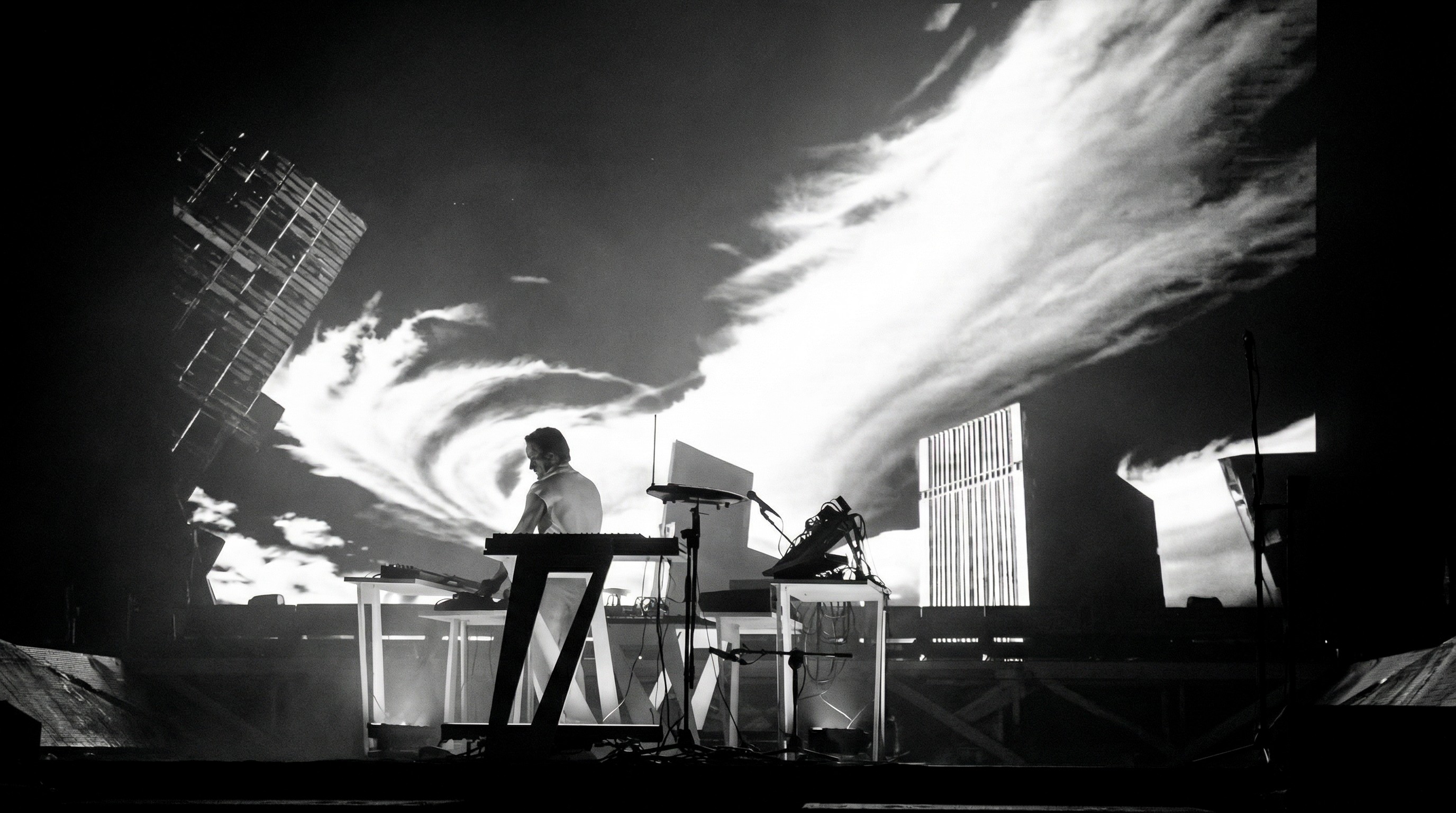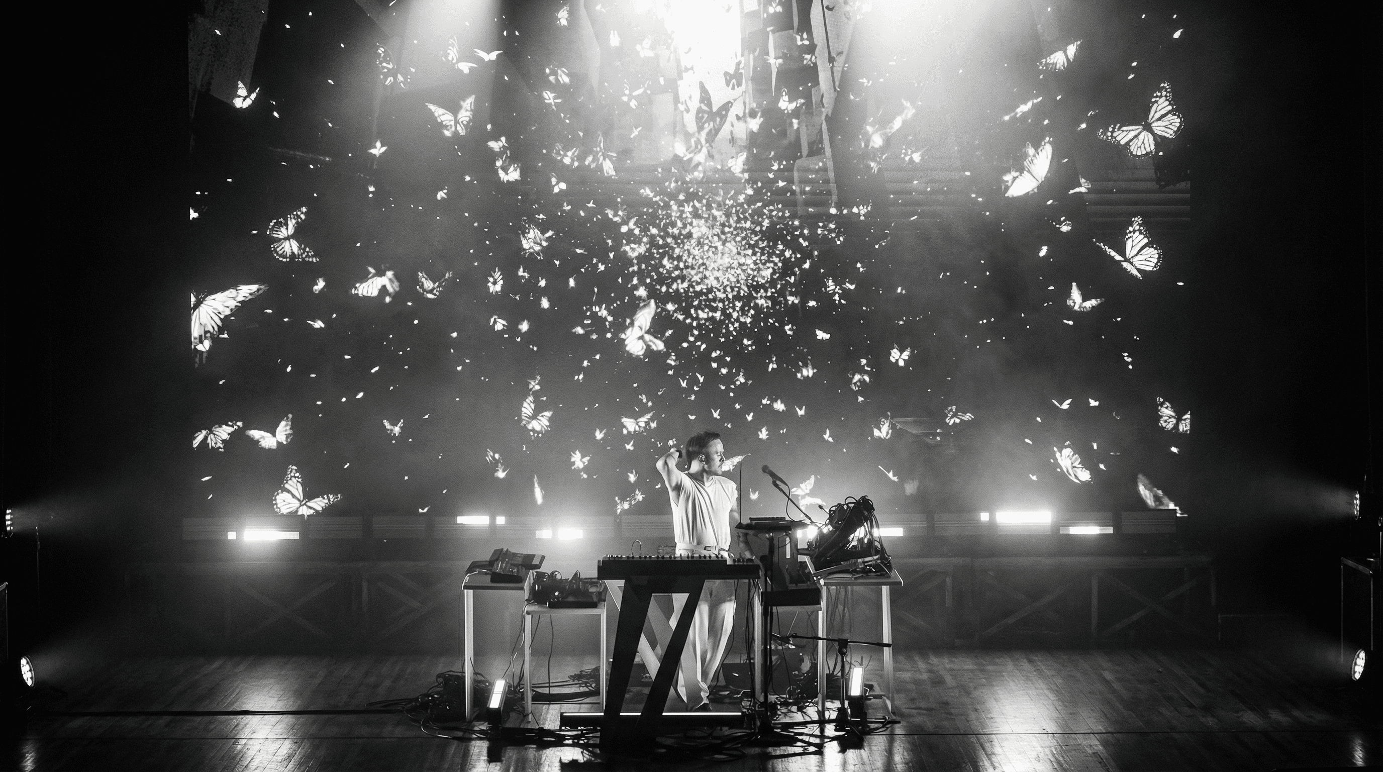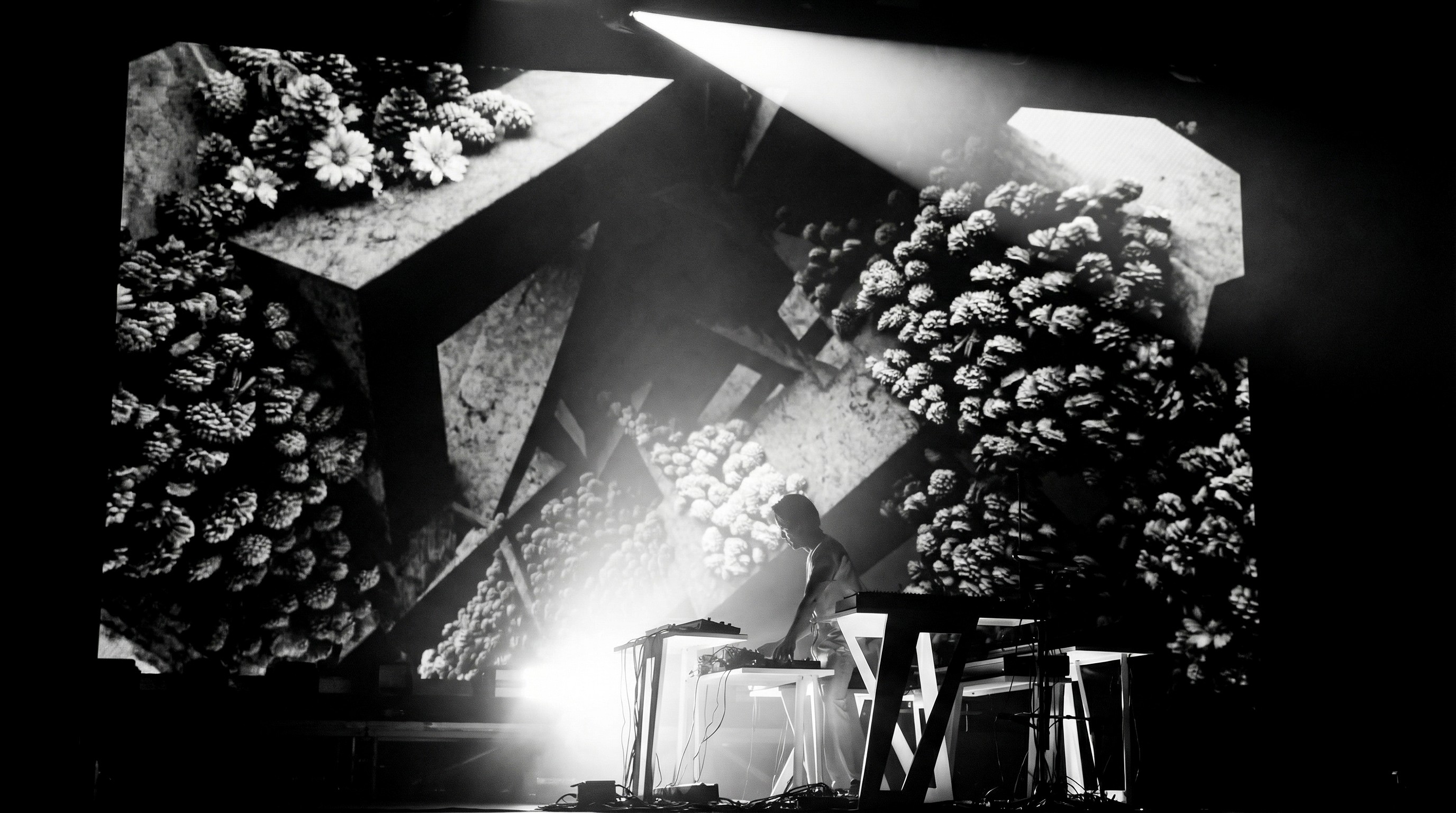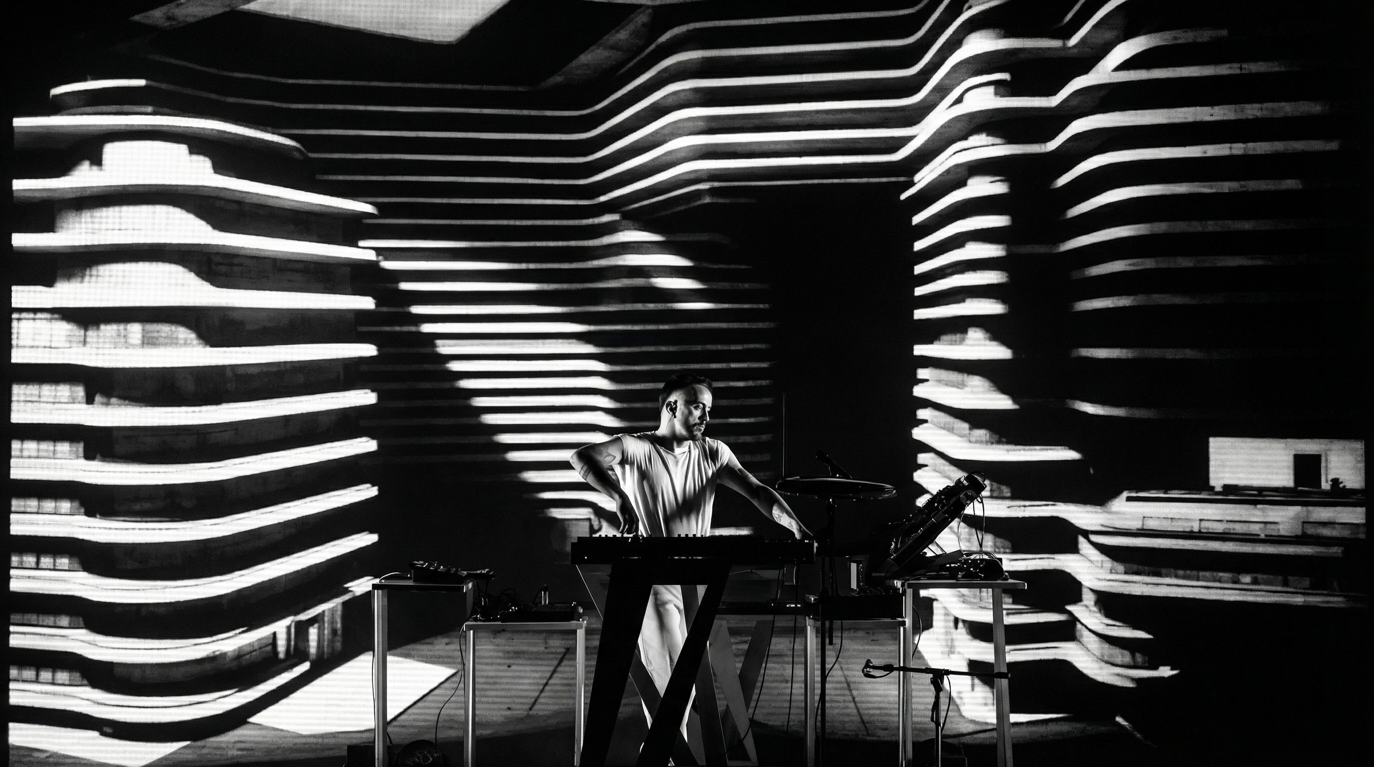 L’intero sistema visivo è stato progettato come autoreattivo alla musica, costruendo un flusso continuo di immagini in evoluzione che accompagna l’intero live set, passando da una dimensione inizialmente monocromatica in bianco e nero fino a una trasformazione finale ricca di colore e materia visiva.