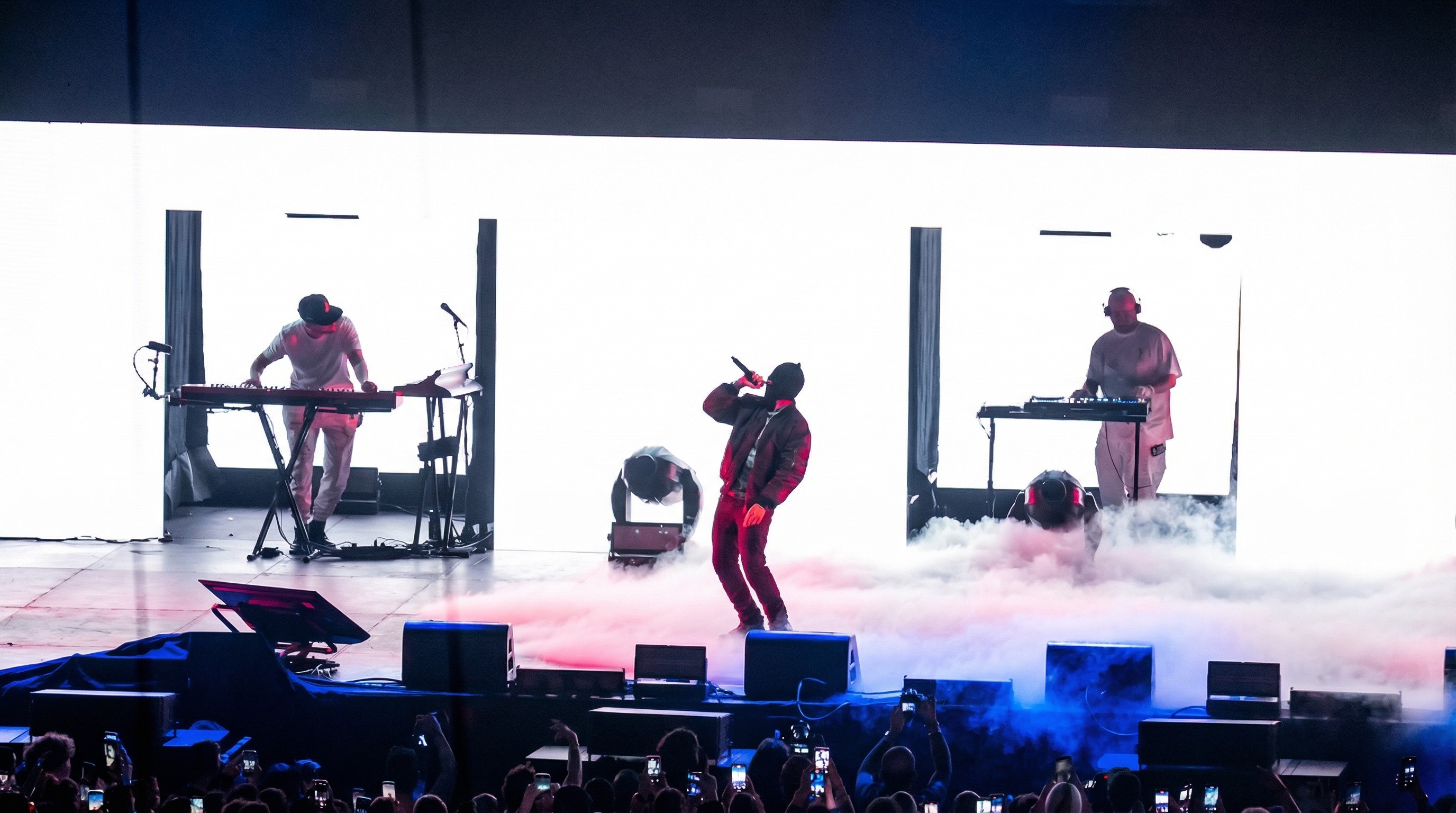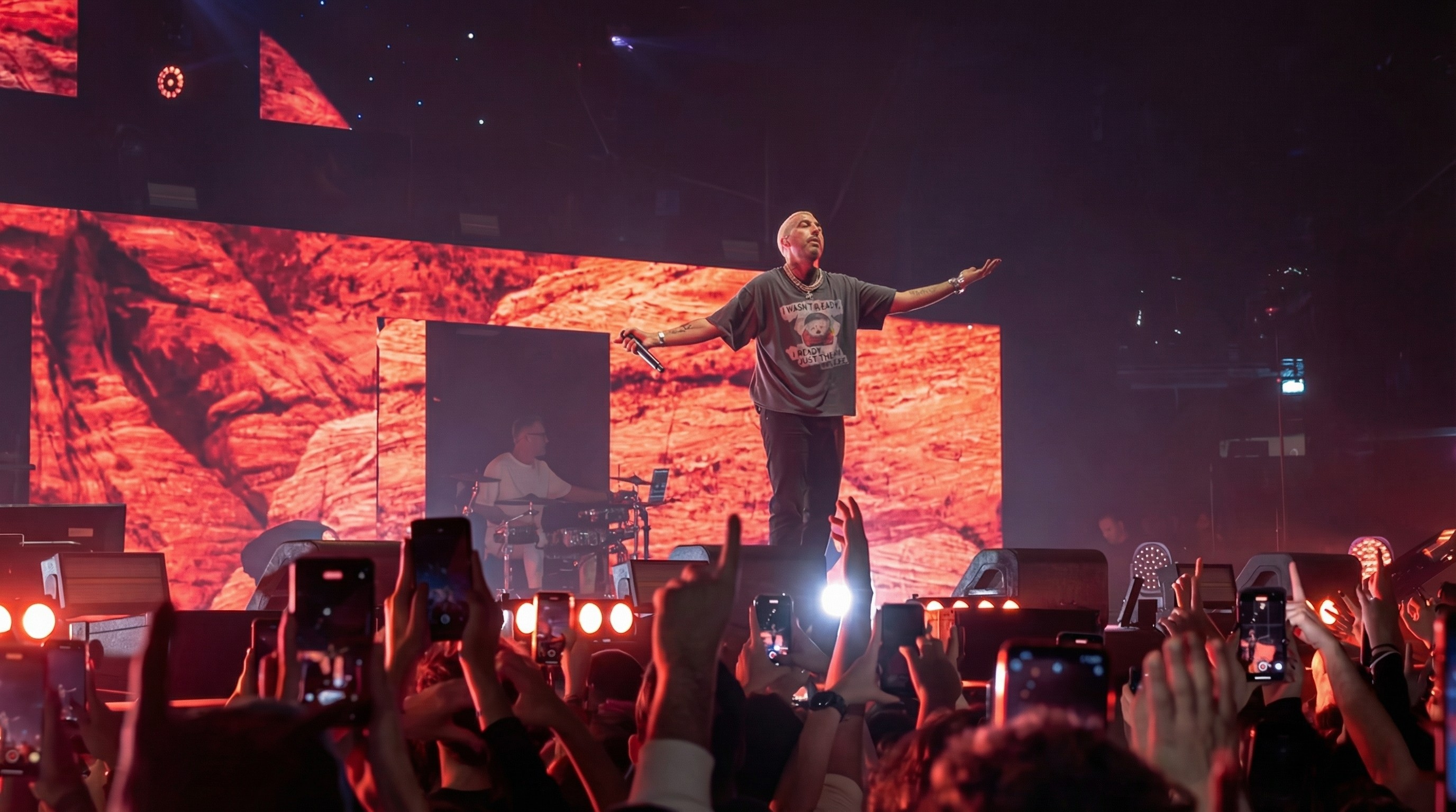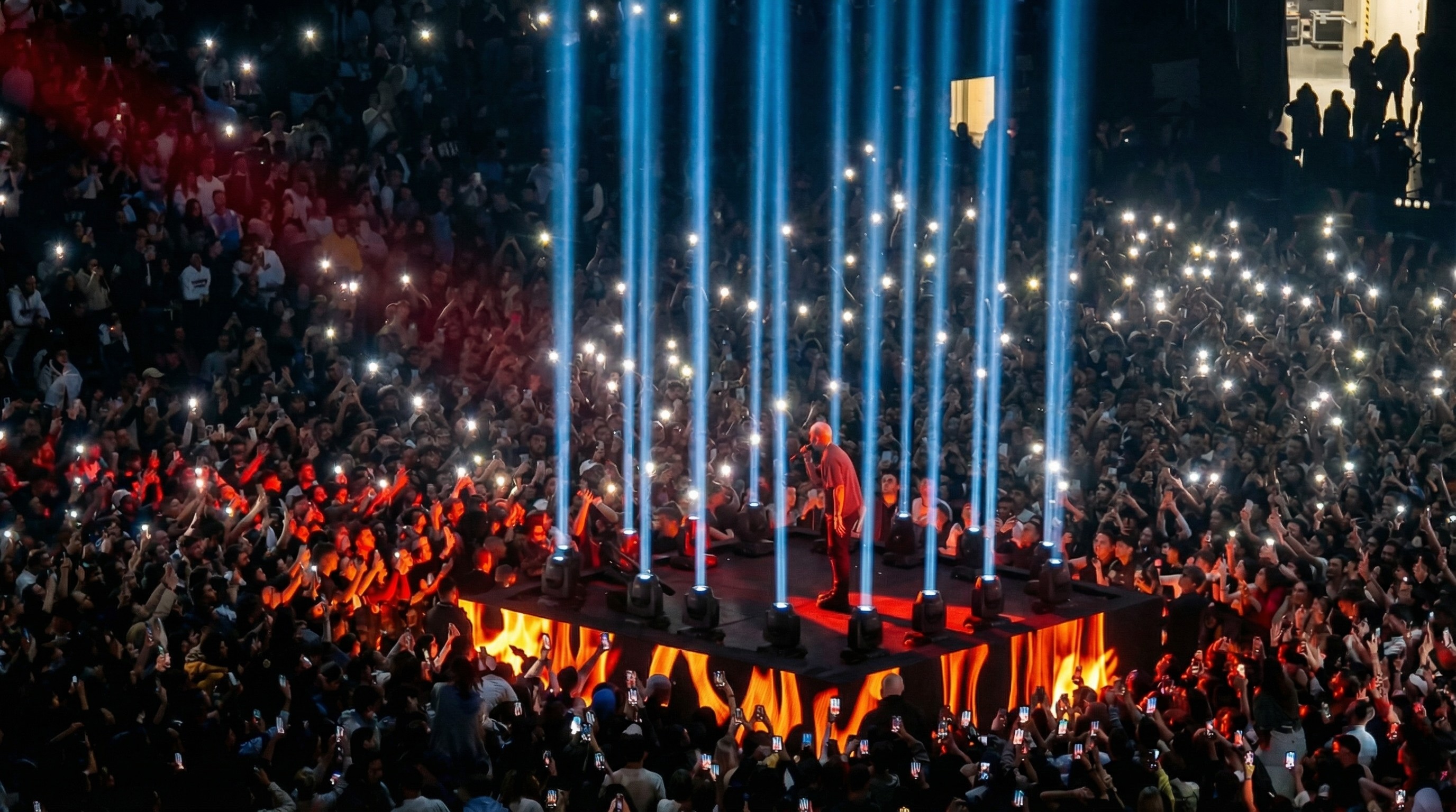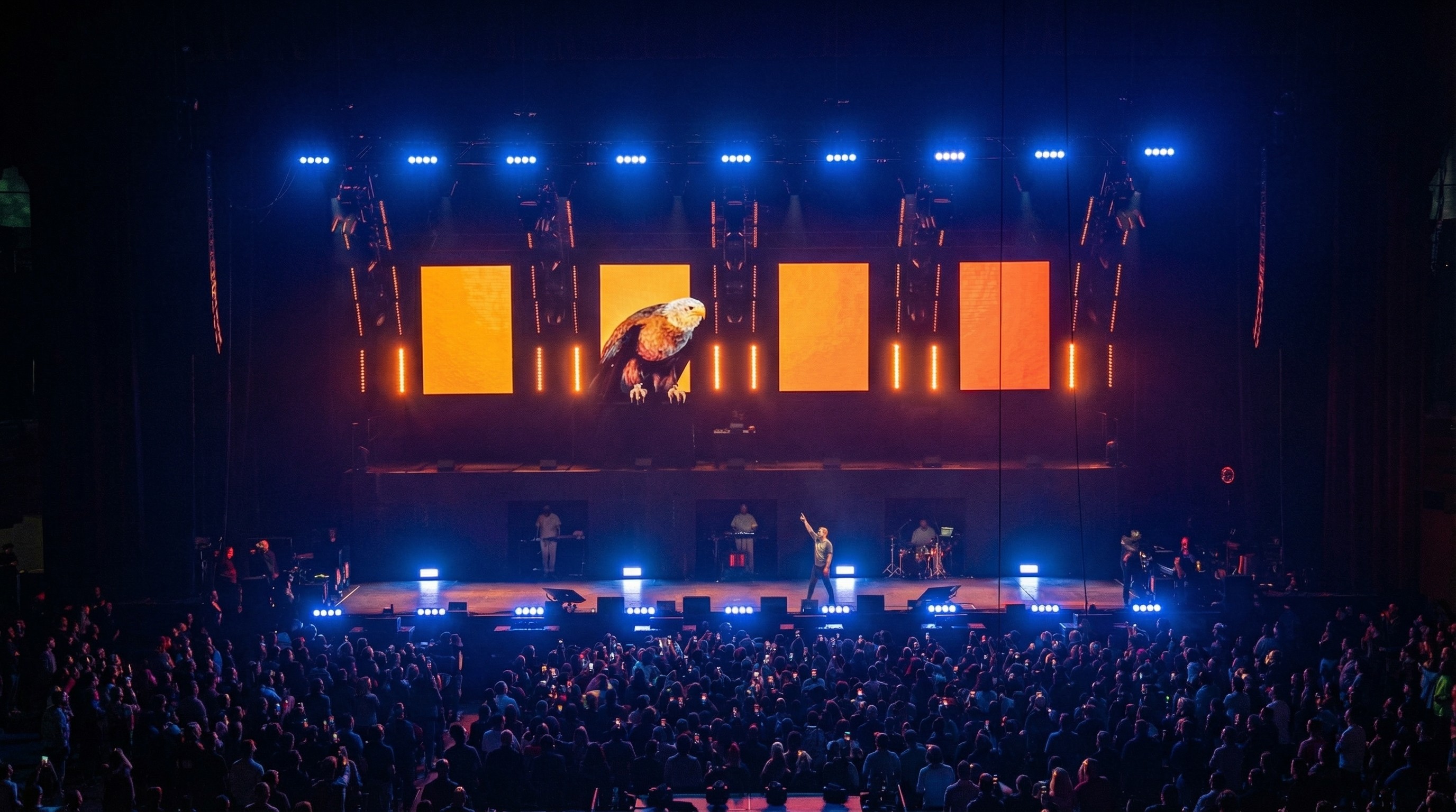 All’interno di questo scenario si inseriva la figura delle aquile, elemento centrale del progetto iconografico, utilizzato come simbolo di elevazione e movimento nello spazio. I visual costruivano così un ambiente sospeso tra dimensione cosmica e immaginario simbolico, accompagnando l’intero live e ampliando visivamente il mondo evocato dall’album.
