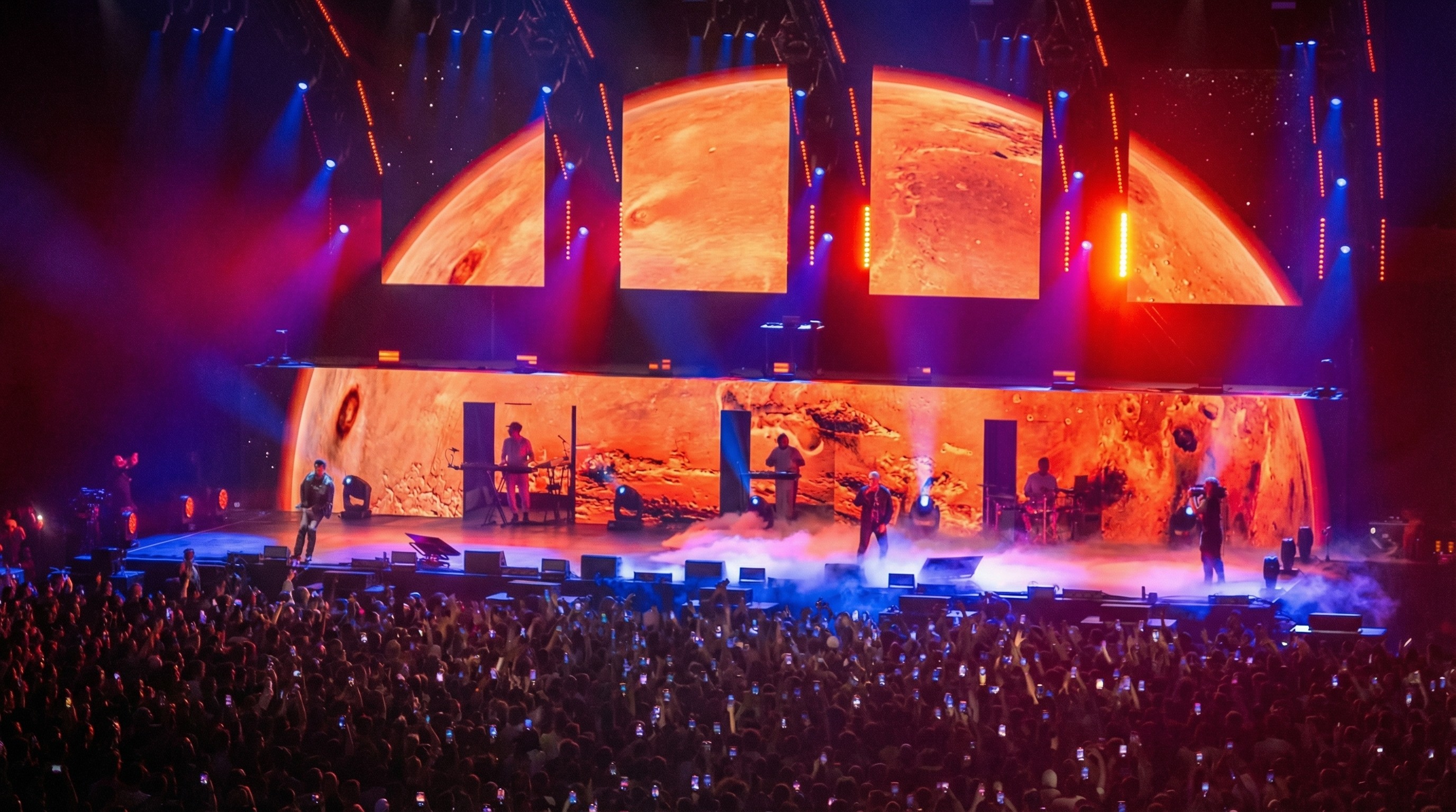 Pianeti, paesaggi cosmici e atmosfere spaziali diventavano lo sfondo narrativo dei visual, con la presenza ricorrente di Marte e di altri corpi celesti.