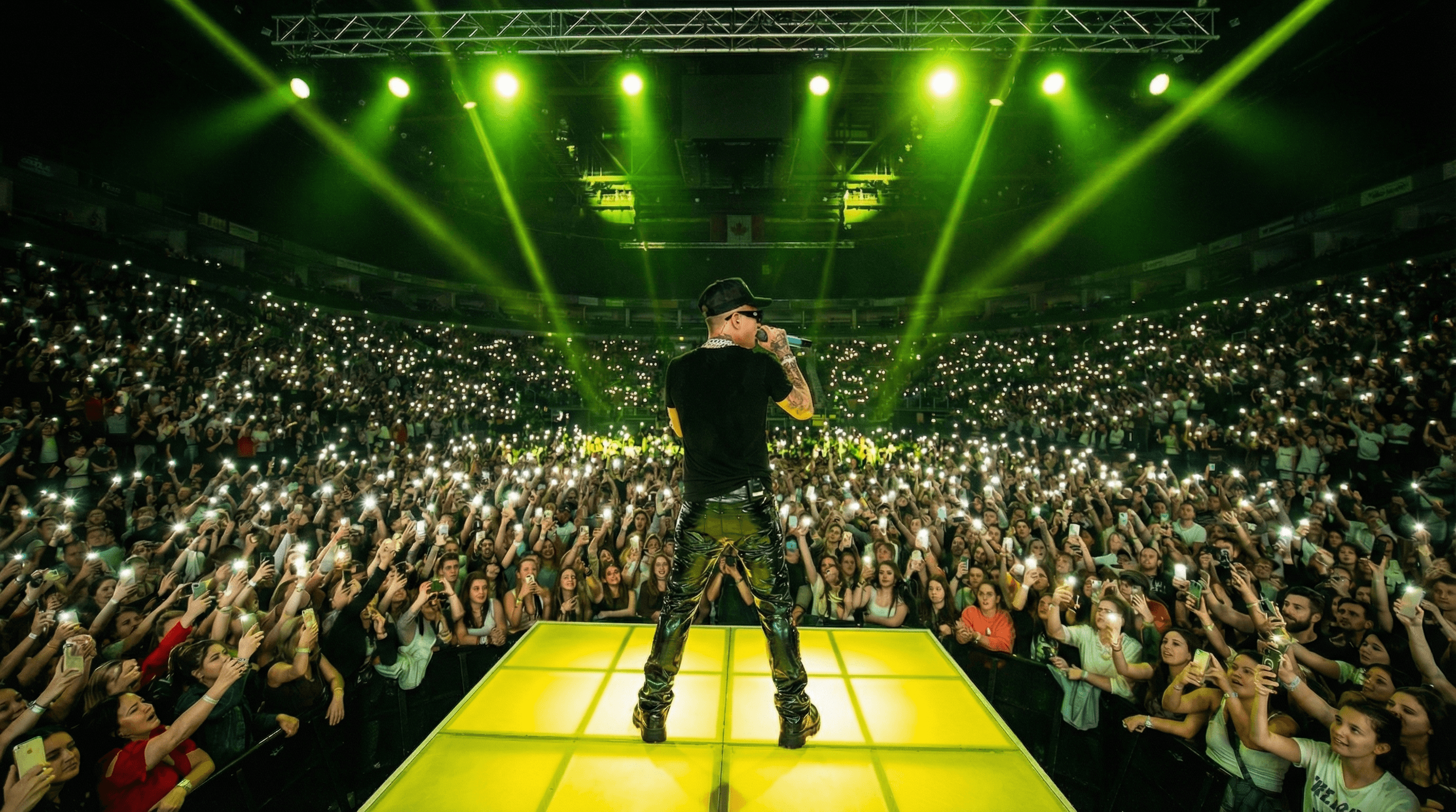 Lo spettacolo presentava una struttura scenica complessa, caratterizzata da due palchi collegati da un pantografo mobile che permetteva continui spostamenti e variazioni di prospettiva durante la performance. All’interno di questo sistema è stata sviluppata la regia complessiva dello show, progettando la dinamica dei movimenti sul palco e la relazione tra artista, ballerini e scenografia.