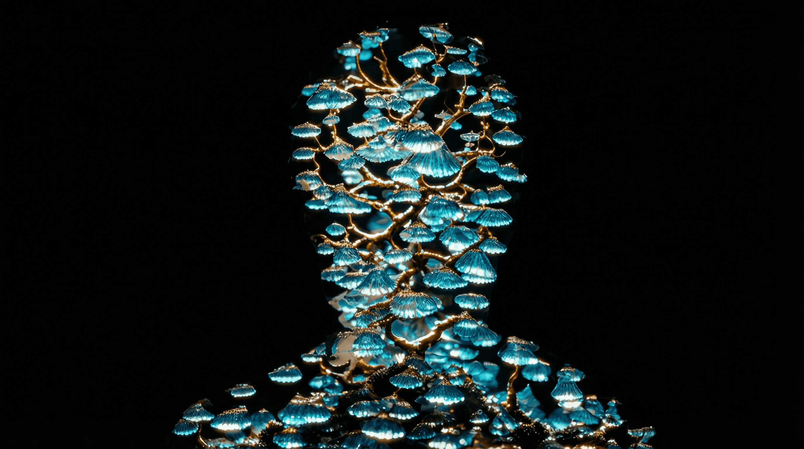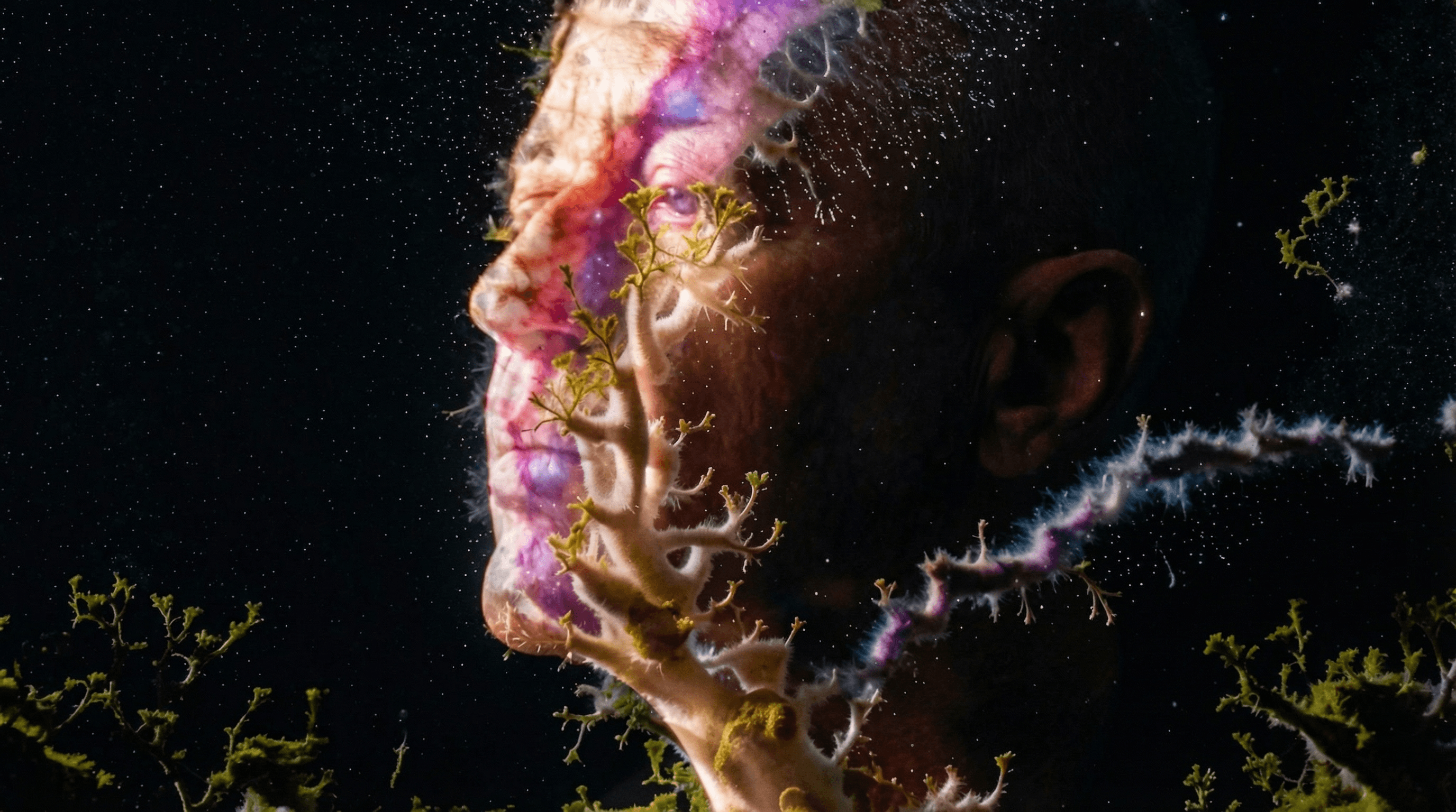 Le fisionomie si modificano e si fondono con elementi organici e cosmici, dando origine a forme ibride che richiamano funghi, strutture naturali e materia spaziale.